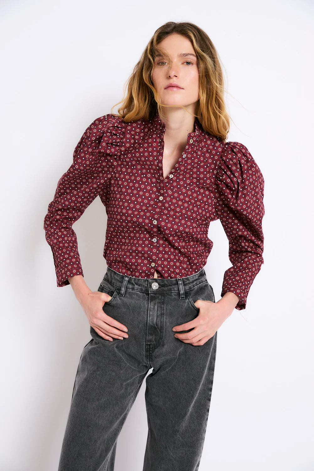 Blusa de algodón en tono burdeos con estampado de pequeñas flores. Presenta un diseño entallado con manga larga abullonada en el hombro, que aporta volumen y estructura a la prenda. Cuello redondo tipo mao y cierre frontal con botones nácar.