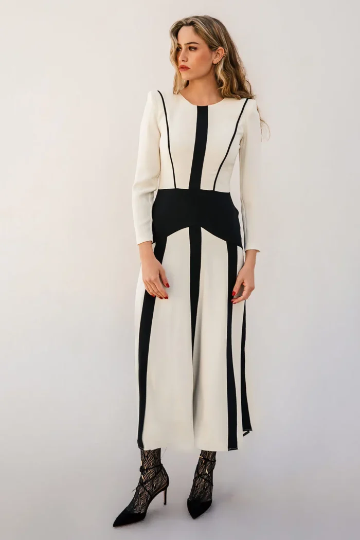 Vestido en crepe con manga larga cuello a la caja y contrastes. Marca COLOUR NUDE.