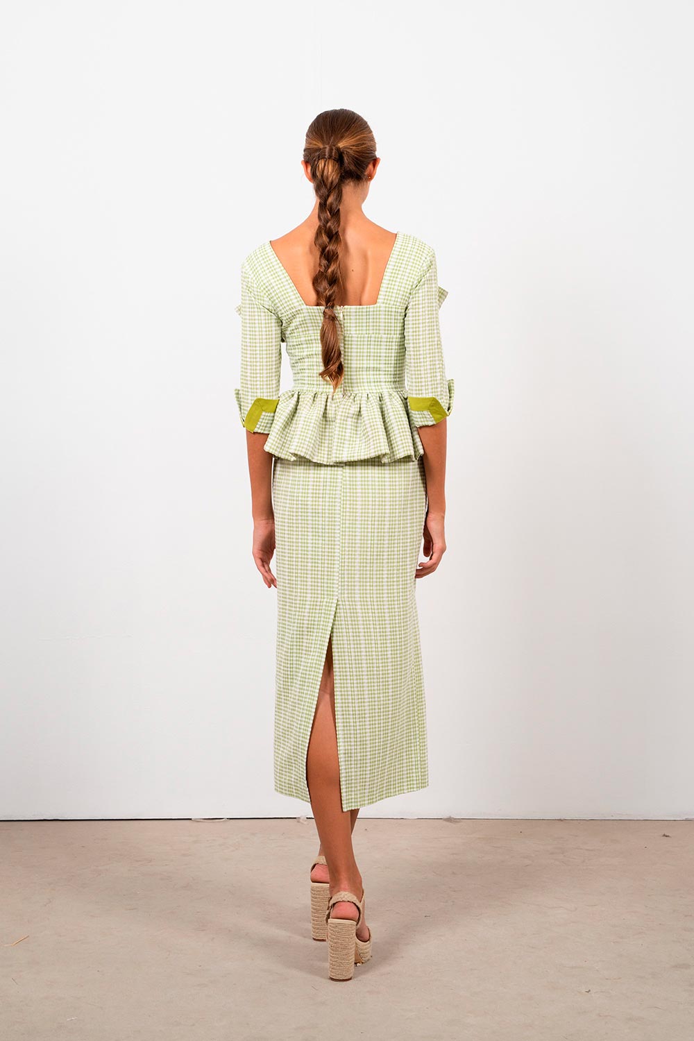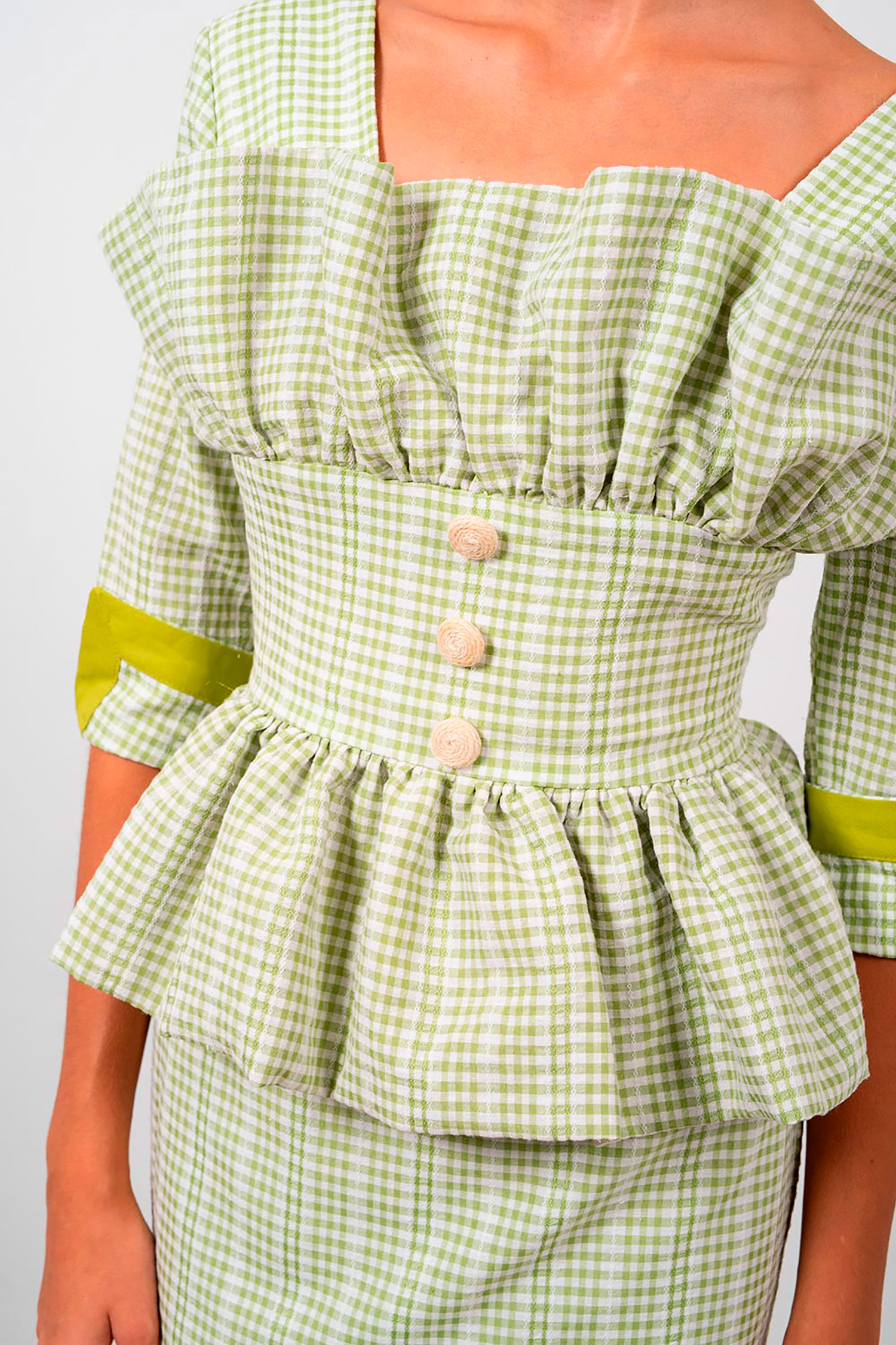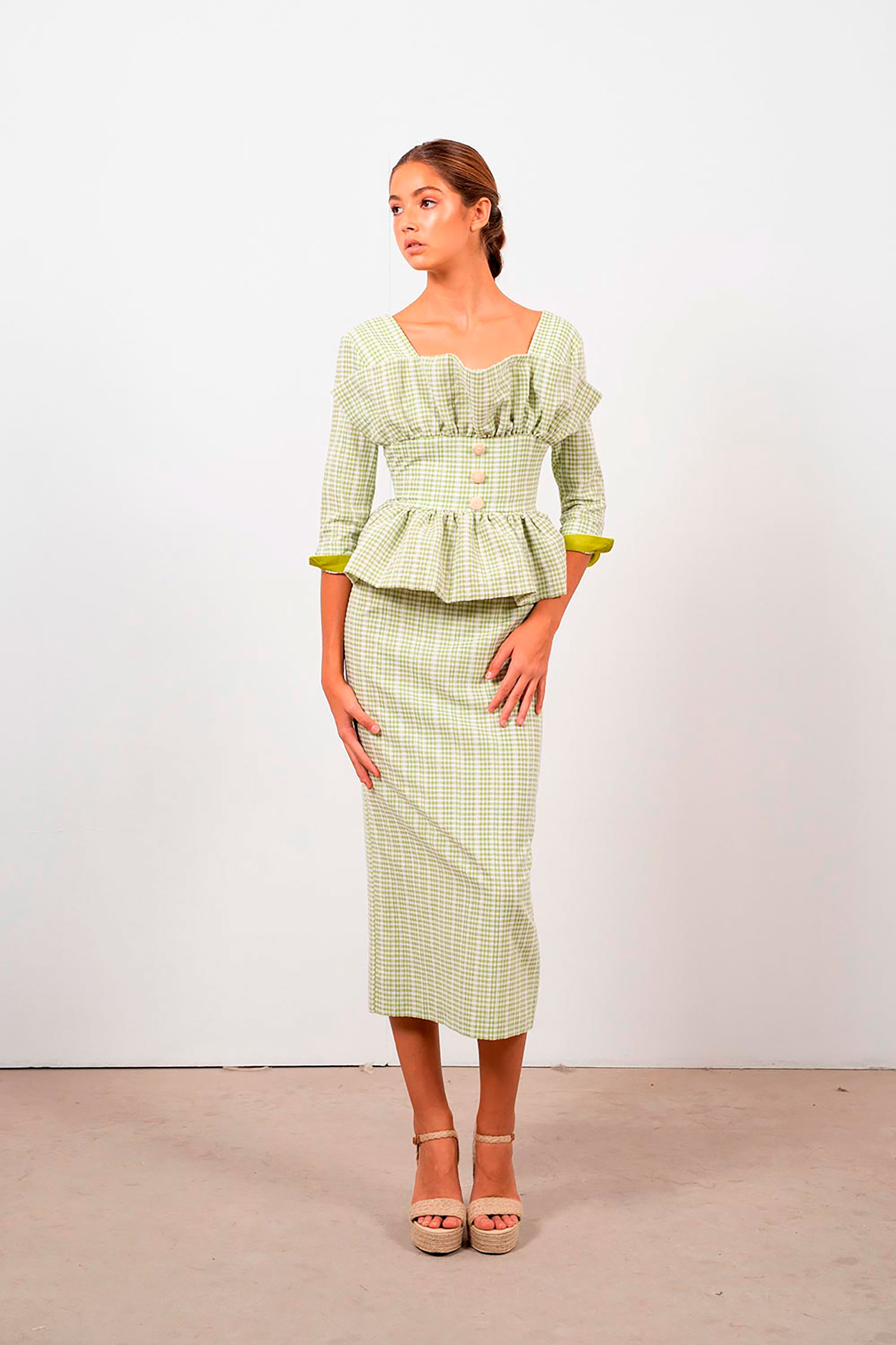 Vestido midi en algodón estampado en vichy, con detalles de peplum, botones de rafia y puño vuelto a contraste.