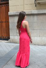 Vestido largo con escote de cuello halter cruzado en un tono fucsia súper favorecedor y con remate de bajo en volante.