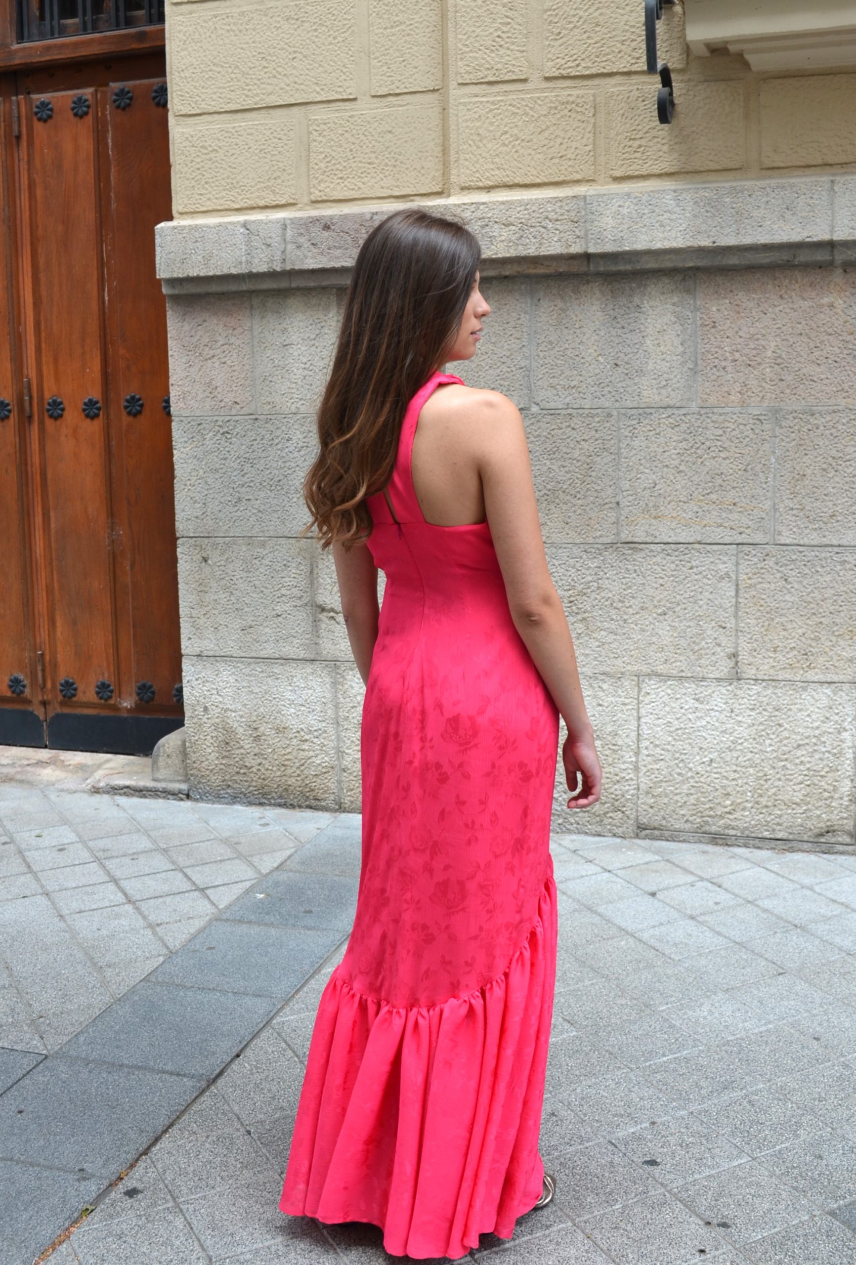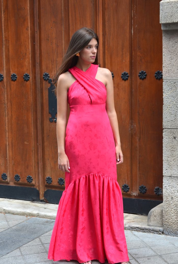 Vestido largo con escote de cuello halter cruzado en un tono fucsia súper favorecedor y con remate de bajo en volante.