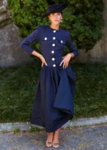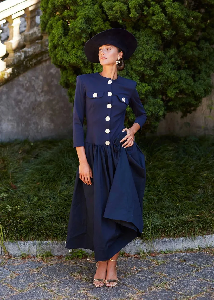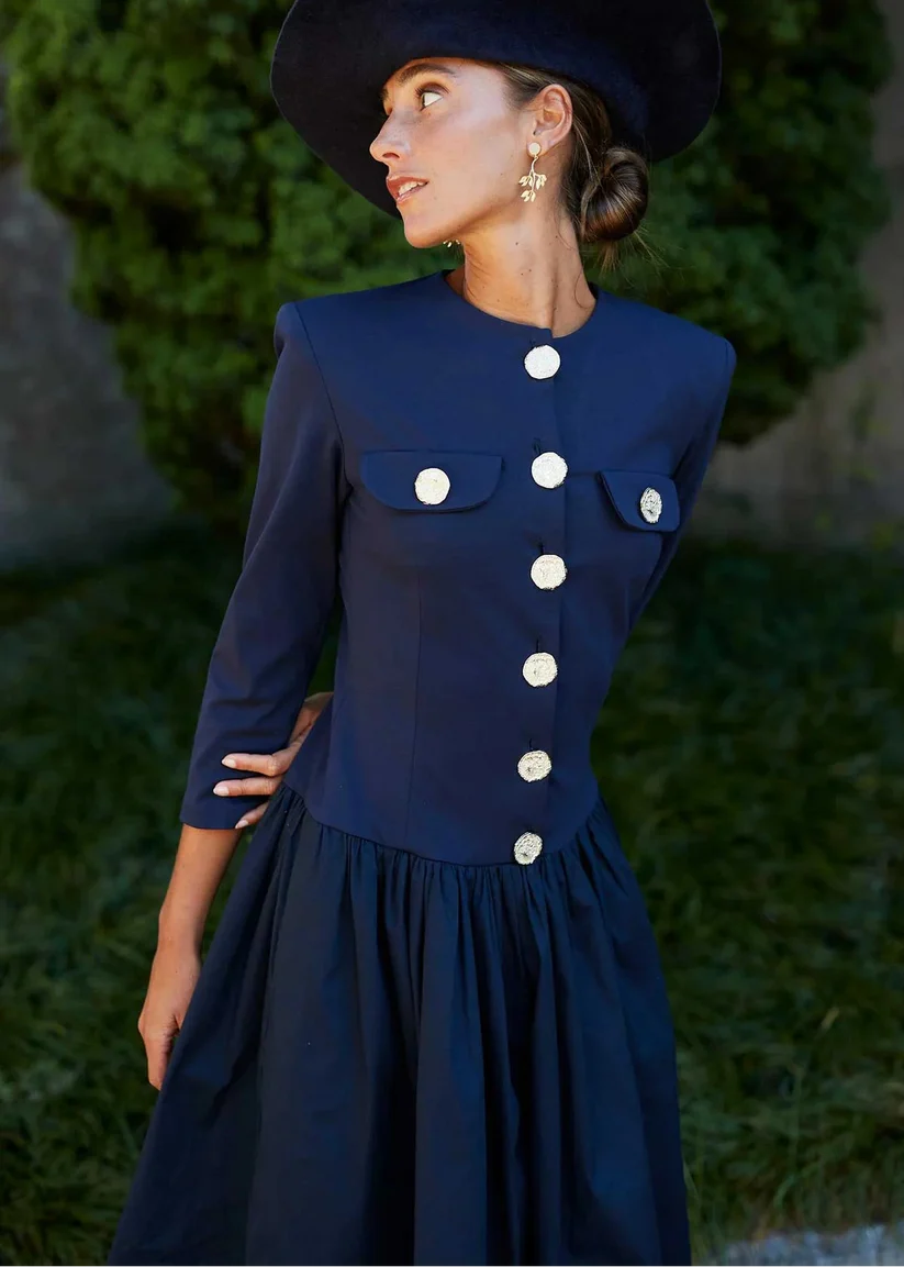 Aporta un aire sofisticado y atemporal a tu look con este vestido midi azul marino, diseñado con botones joya en contraste que realzan su estilo único. Su parte superior entallada con cuello redondo y mangas francesas aporta elegancia, mientras la falda con volumen sutil crea un movimiento delicado y favorecedor. Ideal para bodas de día, eventos de otoño o celebraciones con dress code especial, es una prenda versátil y chic para la invitada que quiere destacar sin renunciar a la comodidad.