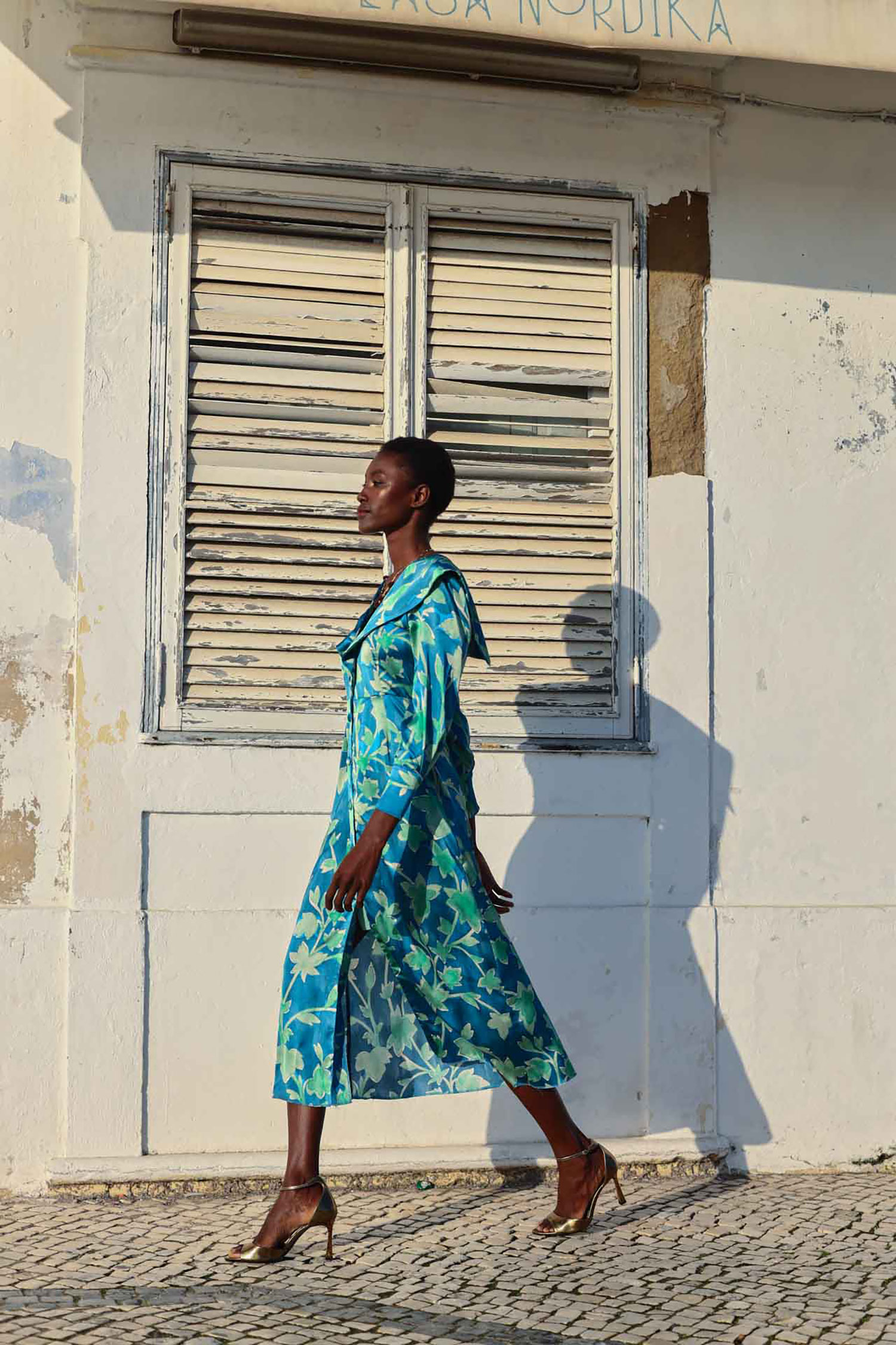 Vestido fluido satinado con estampado exclusivo de la marca. Escote a pico rematado con solapa y manga abullonada.