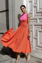 Vestido bicolor en georgette con drapeados en la cintura elaborados de forma artesanal.