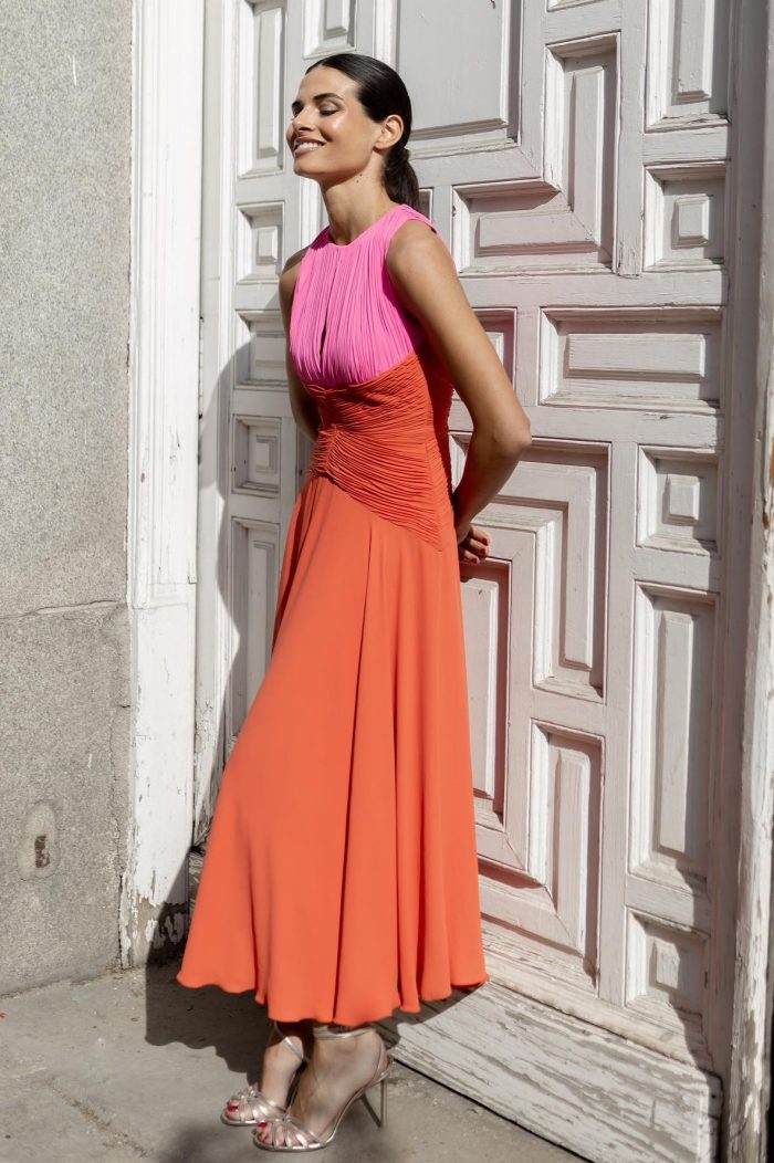 Vestido bicolor en georgette con drapeados en la cintura elaborados de forma artesanal.