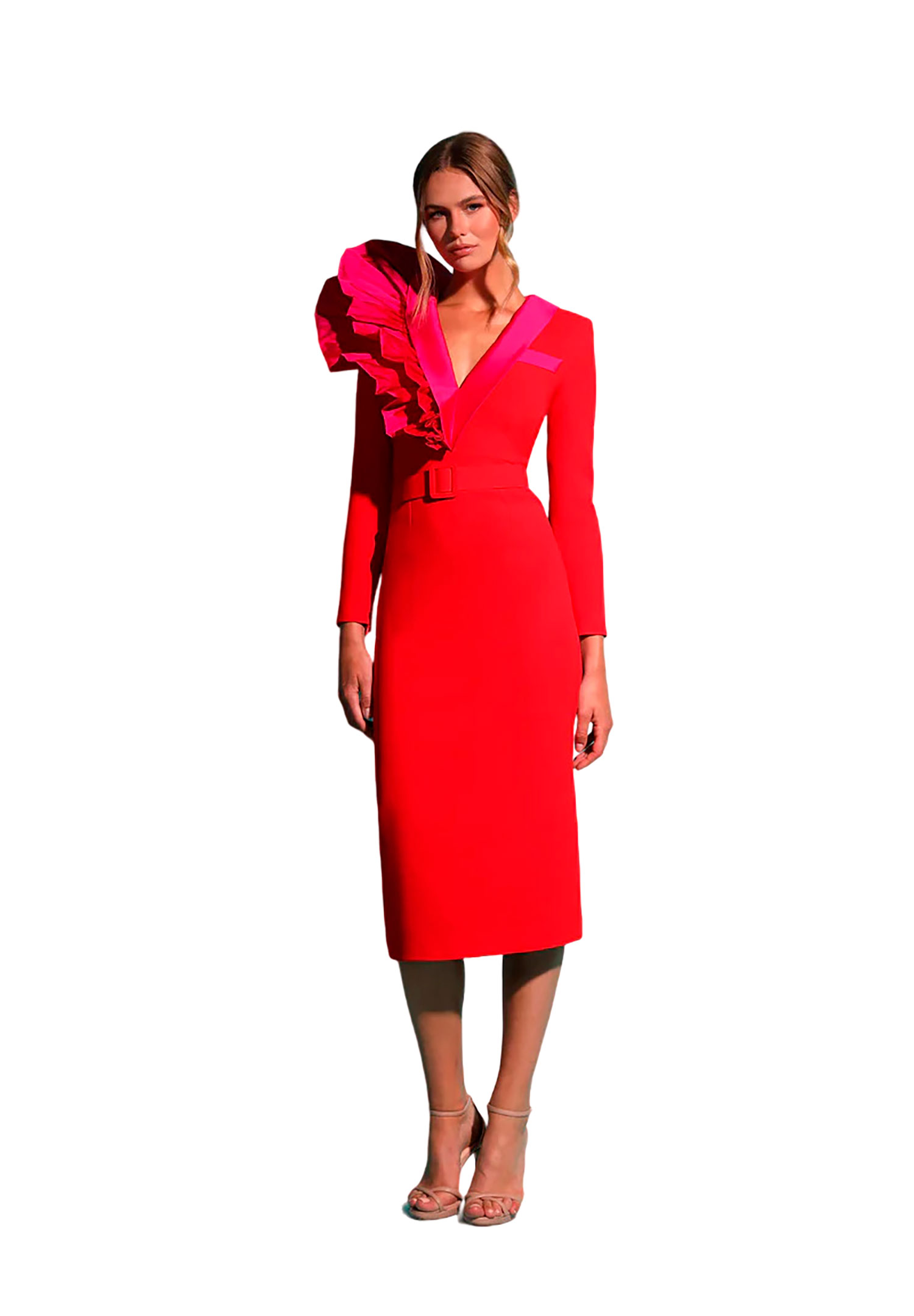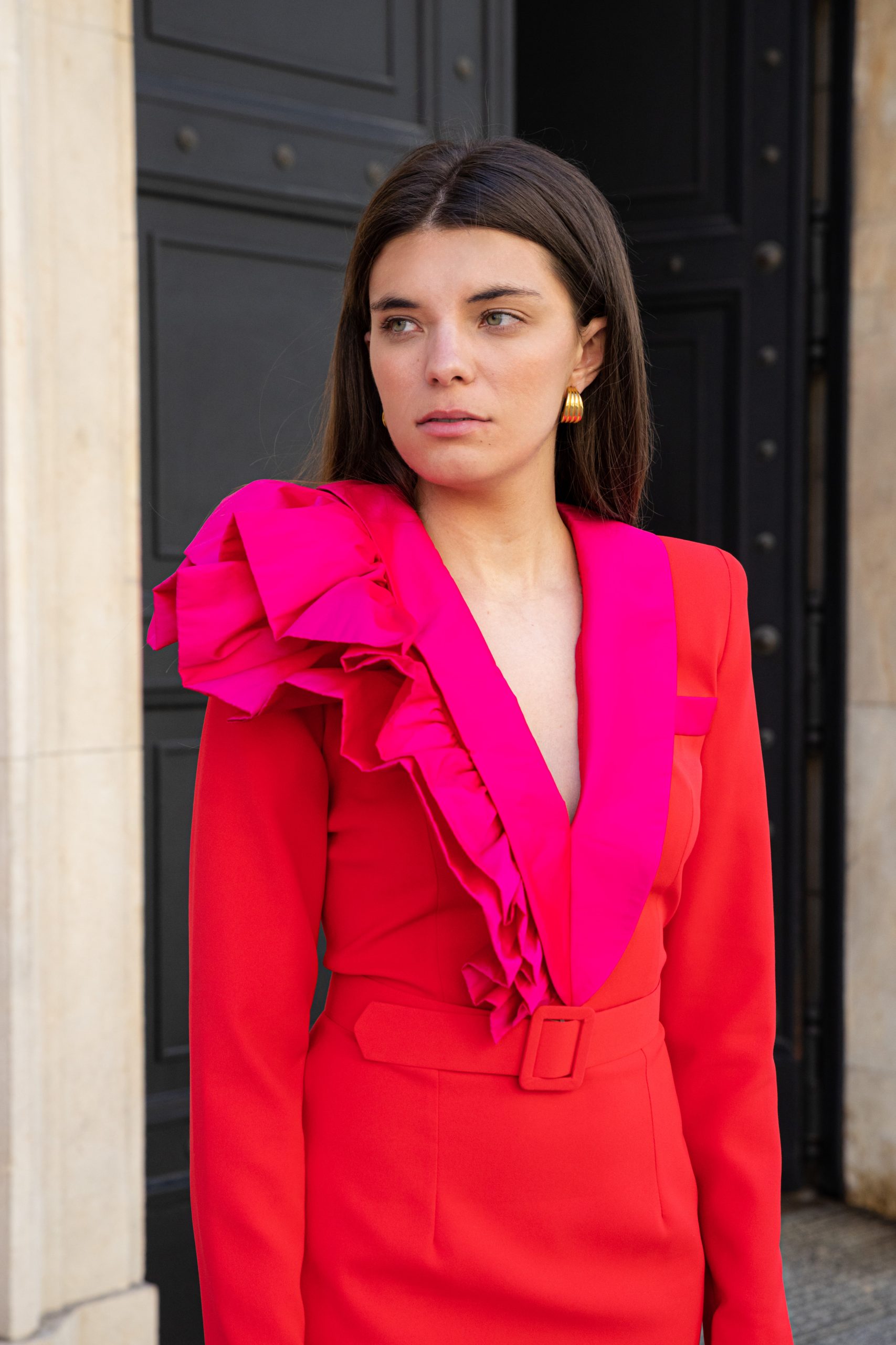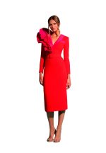 Vestido en crepé rojo con escote de solapa de esmoquin y volantes en contraste fucsia. Hecho a mano en España.
